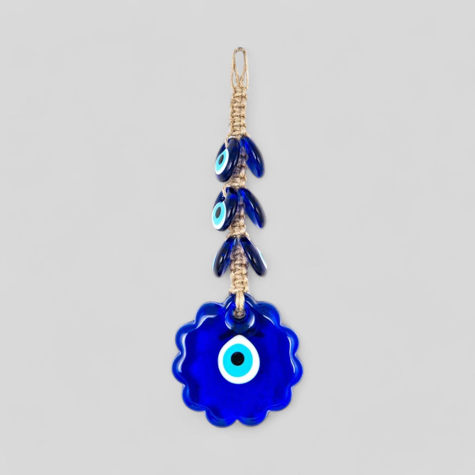 Handcrafted with meticulous attention to detail, our wall-hanging evil eye features 6 smaller evil eyes and a large blue evil eye charm, shaped like a flower. The vibrant blue hue symbolizes spiritual protection and wards off negative energy, bringing harmony and positivity to your surroundings.