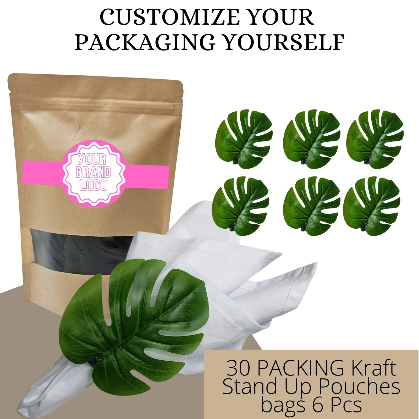 This wholesale box with with 30 PACKING Kraft Stand Up Pouches bags of the 6 pieces of one the MONSTERA LEAF NAPKIN RINGS are ideal for events, weddings, parties, bars, restaurants, hotels or even small stores.
